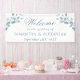 Ein schlichtes und zartes Begrüßungsbanner mit weichen, staubblauen Blätter in Aquarelltönen, die die Namen der Braut und des Bräutigams mit einem eleganten Drehbuch umgeben. Delikate Blätter, um Ihren wichtigen Tag in Harmonie mit der Natur zu feiern. Sie können den Text aus dem Menü Personalisieren ändern und mit den bereitgestellten Tools weiter anpassen. Wenn Sie Hilfe und andere passende Produkte benötigen, kontaktieren Sie mich bitte.