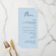 Elegant dusty Blue Empfang Menu Karte für Hochzeit oder Abendessen. Modernes, einfaches und elegantes Design mit schöner moderner handgeschriebener Kalligraphie. Vorder- und Hintergrundfarbe in staubblauem Ton. Möglichkeit zur Änderung sowohl der Vorder- als auch der Hintergrundefarbe durch Auswahl von "Weiter anpassen". Design in einer Vielzahl von Farben verfügbar. Teil unserer Kollektion "Dusty Rose and Dusty Blue Event Signs and Products" mit einer Vielzahl von Produkten zur Koordination, einschließlich Sitzplakaten, Tischnummern und Veranstaltungsschildern.