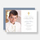 Elegant Dusty Blue Cross Foto Boy First Communion Einladung