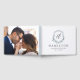 Elegantes, blumengeschmücktes Gästebuch mit einem Monogramm, das in schwarzer Kalligrafie-Schrift dargestellt ist, umgeben von einem Wappen mit staubigen Rosen, üppigen Eukalyptus-Blätter und üppigem grünem Blattwerk. Personalisieren Sie das staubblaue BlumenGästebuch mit Ihren Namen und Hochzeitsdetails unten. Fügen Sie dem Rückgrat einen benutzerdefinierten Text hinzu, z. B. Ihren Namen, Ihr Hochzeitstermin usw. Das hintere Gästebuch im Blumenmuster zeigt Ihr Foto der horizontalen Verlobung.