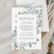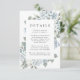 Elegante Blumenzettel mit Hochzeitsdetails, gerahmt von staubigen Rosen, Hydrangeas, üppigen Eukalyptus-Blätter und Grünpflanzen. Die staubigen Blumenkarten sind perfekt für Ihre Hochzeit im Frühjahr oder Sommer. Entworfen, um mit unserer eleganten Dusty Floral Hochzeitskollektion zu koordinieren.