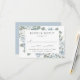 Elegante florale Hochzeitskarten mit Ihrem gewählten Antwortdatum und einer Auswahl an Speisen, gerahmt von staubigen blauen und weißen Rosen und Hydrangeas mit üppigen Eukalyptus-Blätter und Grünpflanzen. Die dustigen blühenden Hochzeitskarten RSVP wurden entworfen, um sich mit unserer Hochzeitskollektion Elegant Dusty Blue Floral abzustimmen.
