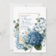 Invite your guests with breathtaking elegance using this sophisticated floral wedding invitation. The design showcases a stunning, painterly watercolor bouquet arranged gracefully along the bottom and left side against a clean white background. A magnificent dusty blue hydrangea cluster provides a lush focal point, beautifully complemented by large, soft white and blue-tinged flowers, reminiscent of peonies. This exquisite arrangement is artfully interwoven with delicate beige and white filler flowers and sprays of dusty sage-green eucalyptus leaves, creating a fresh, romantic, and sophisticated feel. A minimalist, thin gold rectangular frame provides a perfect, modern space for your event details. Perfect for sophisticated weddings (especially with a 'something blue' theme), this design is also ideal for elegant bridal showers, milestone birthday celebrations, anniversary parties, baby showers, or upscale garden events. This versatile design can also be adapted for sophisticated corporate galas, charity fundraisers, or elegant announcements requiring a touch of refined floral beauty.