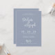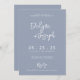 Eine elegante, einfache, minimalistisch blaue Hochzeitsvorlage Einladung. Das ist ein schlichter, staubblauer Hintergrund. Und weiß, mit der Hand die Vornamen der Braut und des Bräutigams und die bearbeitbaren Infos mit den Namen der Website, der Braut und des Bräutigams auf der Rückseite. Erschwinglich und es ist digitale elektronische e-Einladung auch . Alle Informationen können durch Anklicken des Buttons Personalisieren angepasst werden. So packen Sie es und machen Sie es zu Ihrem, sodass Sie verlobt und aufgeregt einladen .
