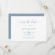 Mit diesen minimalistischen und eleganten Karten können Sie Ihre blaue Hochzeitsfeier verkünden. Einfach online personalisieren. Matching Artikel zur Verfügung, um diese staubige blaue Hochzeit zu ergänzen speichern Sie die Datumskarte mit einem modernen Skript.