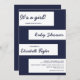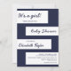 Dieses elegante, blau-weiße Baby-Duschbad eignet sich perfekt für eine moderne Hochzeit, das schlichte Design zeichnet sich durch elegante blaue Kalligraphie auf weißen Streifen auf marineblau Hintergrund aus.