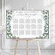 Das elegante, horizontale Hochzeitsstempelposter zeichnet sich durch ein modernes Kalligraphie-Skript-Monogramm der Braut- und Bräutigamen und ein Bio Aquarellendesign mit Eukalyptusblättern, Blätter und silbernen Eukalyptuszweigen in sanften Grüntönen von Minze, Grün, Oliven und Blau aus. Ideal für einen Frühlings- oder Sommeraufenthalt. Personalisieren Sie mit Ihren Hochzeitsgästen und Tischnummern für Ihren rustikalen, schicken Hochzeitstag.