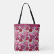 Rote Rosen, rosafarbene Pfannkuchen und lila Lilacs auf weißem Hintergrund schaffen eine schöne Tasche mit Vintagem Look. Ein kräftig gefärbtes Bar am oberen Ende, in einem sich ergänzenden Rot-Schatten, hat Platz, um mit Ihrem Namen zu personalisieren.