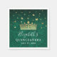 Looking for elegant party décor to match your gold and green celebration theme? Design your own enchanting personalized paper napkins using this easy DIY template - perfect for adding your event name, date, or special thank you message. Featuring original fairy tale artwork by Raphaela Wilson, the whimsical showcases luxurious green watercolor roses accented with a faux metallic gold crown and magical butterfly confetti. Ideal for an enchanted forest quinceañera (XV), a fairy tale sweet 16 birthday party, a princess baby shower, or a St Patricks's day bridal shower, these custom napkins bring a sophisticated touch to your table setting. Prefer a different accent color? You can easily switch the faux metallic gold details to rose gold blush pink, elegant silver, or any color (svg graphics) to suit your fancy. Feel free to further customize the background by adding in a vintage old scroll parchment paper texture, or by changing the calligraphy script and modern typography to create a truly unique, royal-inspired keepsake for your celebration. Enjoy! Category: mis quince anos quinceanera napkins; emerald rose wedding paper napkins; and cute green baby shower paper napkins for her / daughter. Emerald green quinceañera party theme: emerald, dark green, shamrock green, light jade, black, and white (with options in yellow champagne gold, silver and rose gold pink).