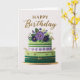 A sophisticated birthday card featuring a beautifully decorated two-tier cake adorned with purple floral accents, lush greenery, and gold details. The elegant design paired with shimmering “Happy Birthday” lettering makes this card perfect for celebrating someone with timeless style and grace.