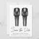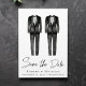 Elegante und schicke Gay Hochzeit speichern Sie das Datum Ankündigung mit zwei tuxedo Wasserfarben und "Save the Date" in einem stilvollen Skript. Fügen Sie Ihre Namen, Hochzeitstag und Ort in der modernen Typografie. Personalisieren Sie Ihre Daten auf der Rückseite.
