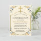 Feiern Sie die Bestätigung Ihrer Tochter mit Freunden und Familie, indem Sie sie zu Ihrem Service und Empfang mit diesem eleganten Imitat Gold Confirmation Einladung. Diese Girls-Bestätigung lädt ein schönes, schlichtes, goldenes Kreuz mit einem goldenen Rahmen vor einem weichen Buttercreme-gelben Hintergrund und Aquarellfarben-Blume mit Pfirsich und blauen Bouquets in jeder Ecke.
