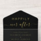 Elegante, schwarze, alleinstehende Hochzeitseinladung mit dem Titel "Happily Ever After" in einfacher Schrift und einem schicken Kalligrafieschrift mit Wimpern und Ihren Einladungsdetails in klassischer Serifentypografie, alles in Ihrer Wahl von echter Goldfolie, Silber oder Rose gerendert. Eine weiße, wegreißende Postkarte bietet eine bequeme UAWG für Ihre Gäste.