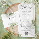 Alles in einer Hochzeitseinladung mit botanisch grünen rustikalen Blätter, die über einen goldenen Bogen mit eleganter Typografie fallen. Die Einladung enthält eine perforierte RSVP-Karte mit Ihrem Hochzeitswebsite QR Code. Entwickelt von Thisisnotme©