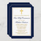 Elegante Navy Blue und Gold Erste Heilige Kommunion Einladung mit Kreuz. Goldrahmen. Gold Cross. Ticket Style.