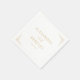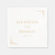 These wedding napkins feature a minimalist and elegant design with a clean, off-white background. The layout includes sophisticated serif typography in a soft gold hue, complemented by decorative geometric motifs inspired by Art Deco, placed at the corners for balanced composition. The mood is one of understated luxury and refinement, perfect for formal occasions like weddings. The design combines classic elements with contemporary minimalism, creating an airy and refined feel that enhances any table setting.