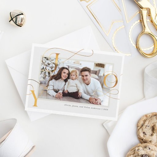 Feiern Sie die Saison mit dieser luxuriösen "Joy"-Urlaubskarte mit einem stilvollen Imitat Goldfolie Typografie-Design und eleganten Wirbel, die ein gepflegtes Foto in einer weichen, weißen und Elfenbeinpalette umrahmen. Das raffinierte Layout hebt das Wort "JOY" in anmutigen, fließenden Buchstaben hervor und macht es zu einem schönen Herzstück für Ihre Feiertagsgruß. Als Teil einer zusammenhängenden Ferienkollektion ist dieses Design auch auf passenden Geschenketiketten, Briefumschlägen und vielem mehr erhältlich. So können Sie für Ihre gesamte Urlaubskorrespondenz ein abgestimmtes und gepflegtes Aussehen schaffen. Ideal, um festliche Wärme und Eleganz mit Freunden und Familie zu teilen.