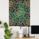 Diese magische Erde botanischen und Universum Elemente mandala bringt Positivität und Freude in Ihre Dekoration. Eine moderne und elegante Mandala mit goldenen, grünen und blauen Blumen und Blätter, verschiedenen Blume, dem Universum, der Sonne, dem Halbmond und den Sternen, Punkten, Streifen und Wirbel, die eine wunderschöne Mandala-Blume bilden, auf einem Amazonasgrün, Blaubeere und einem dunkelblauen Hintergrund.