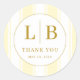 This elegant wedding sticker features a minimalist circular design with alternating cream and soft yellow stripes in the background. The centerpiece includes large, serif initials "L" and "B," separated by a vertical line, above the phrase "THANK YOU" in uppercase letters. Gold accents highlight the text and outline, creating a sophisticated and warm aesthetic. Perfect for expressing gratitude at your special event, this sticker combines modern simplicity with timeless charm.