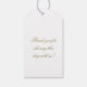 Gastgeschenk Hochzeit Tags mit einem eleganten "Mr. & Mrs." Kalligraphie-Skriptdesign mit individuellem Monogramm der Braut und des verheirateten Namens des Bräutigams mit Hochzeitstermin. Zwei Seiten antikes goldenes Design auf weißem Hintergrund.