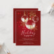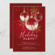 Modern elegance holiday party featuring a red background with trio of Christmas ball ornaments and gold snowflakes