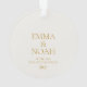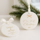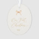 Commemorate your first Christmas together with this elegant ornament featuring refined gold script typography and a delicate watercolor bow. Set on a soft ivory background, it embodies timeless sophistication and warmth — perfect for newlyweds or couples celebrating a special milestone. A beautiful keepsake for your holiday tree or a thoughtful gift for loved ones.