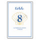 Elegantes Design in der Tischnummer an der Küste mit stilvollem Goldmedaille, Tischnummer und blauen Rahmen. Personalisieren Sie mit Namen und Hochzeitsdatum. Umkehrt zu demselben Design auf der Rückseite. Ideal für Hochzeiten am Strand, im Sommer oder im Wassersport. Design©Rosalind Moore, Cherry Lane Designs.