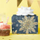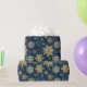 This elegant Christmas wrapping paper has a delicate gold and white snowflake design against a dark blue background. Perfect for wrapping Christmas presents or winter birthday gifts.