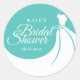 Ein schicker Brautparty-Gunst-Aufkleber mit einem eleganten Hochzeitskleid auf saphirblauem Hintergrund mit einem wunderschönen Schriftzeichen und all Ihren besonderen Brautparty-Details, die in schicken Texten personalisiert sind. Sie können die Hintergrundfarbe anpassen, um sich mit Ihrem Hochzeitstil abzustimmen.