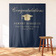 Elegante blaue Graduierungsparty Begrüßung Tapestry und Foto Requisiten mit einem goldenen Gradmütze, "Gratulationen" in einem klassischen Kalligrafieschrift und den Namen, Schule und Klassenjahr des Absolventen in der modernen Serifentypografie.