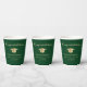 Elegante grüne Graduierungsparty Papier Becher mit einem goldenen Gradmütze, "Gratulationen" in einem klassischen Drehbuch und den Namen des Absolventen, Schule und Klasse Jahr in der modernen Typografie.