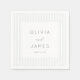 This wedding napkin design features a minimalist and elegant layout with a clean white background framed by vertical gray stripes. The central text area showcases sophisticated typography, combining bold serif fonts for the names and a cursive script for "and," creating a balanced and timeless look. The color palette of soft grays and whites enhances the classic aesthetic, evoking sophistication and simplicity perfect for formal occasions. Ideal for weddings, this design emphasizes clarity and elegance without unnecessary embellishments, making it a refined choice for celebrating love.