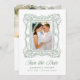 Announce your wedding with this elegant green ornate frame photo save the date, showcasing a hand-drawn antique picture frame around the couple’s vertical engagement photo. “Save the Date” appears in graceful calligraphy, paired with classic serif lettering for the couple’s names, wedding date, and location. The back features a horizontal photo with space below for custom wording and a QR code, making it easy for guests to visit your wedding website. This personalized photo save the date blends natural elegance with modern functionality for a refined wedding announcement.