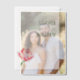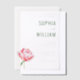 This elegant wedding invitation features a minimalist design with ample negative space, creating a clean and sophisticated look. The muted gray background is complemented by a soft green color palette used for the text, which includes a mix of bold serif fonts for the couple's names and smaller script and serif fonts for additional details. A single, beautifully illustrated pink peony adds a touch of natural elegance to the left side, balancing the textual content on the right. The overall style is refined and formal, perfect for a chic and memorable wedding celebration.