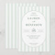 This elegant wedding invitation features a classic design with vertical light green stripes on a darker green background, creating a fresh and sophisticated look. The central oval frame highlights the event details in a clean serif font, emphasizing clarity and formality. Perfect for couples seeking a timeless aesthetic, this invitation conveys an air of elegance and refinement, making it ideal for formal celebrations. Its minimalist approach focuses on typography, ensuring that all essential information is presented beautifully without distractions.