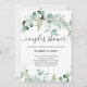 Dieses trendige Paar Polterabend lädt mit seiner eleganten Aquarell Eukalyptus-Vegetation, viel Grün, grünen Blätter und Ästen ein. Sie schmücken einen schlichten, weißen Hintergrund mit moderner Schriftzypografie. Auf der Rückseite der Karte befindet sich ein Platz für einen scannbaren QR-Code, sodass die Gäste leicht uAwg machen können. Die perfekte Art, Freunde und Familie zum Feiern einzuladen!