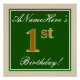 Dieses schlichte und elegante Geburtstagsgestapel mit einer personalisierten Botschaft wie "ANameHere’s 1st Birthday!" (mit dem "1st" mit einem Imitat/Imitation goldfarbenem Aussehen) in einem grünen quadratischen Bereich mit einer schlichten Kontur an der Grenze. Der Name ist in einem Text in weißer Schrift und kann personalisiert sein. Ein personalisiertes Geburtstagsgestapel wie dieses könnte vielleicht als Dekoration in einem Party für jemanden verwendet werden, der seinen ersten Geburtstag feiert. [~Z0000235]
