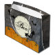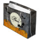 Stilvolle Halloween-Geschenktasche mit gotischem Monddesign mit Fledermäusen, orangefarbenen Kürbissen und dem Wort "Boo!" in eleganter Schrift. Ideal zum Umhüllen von Halloween-Party-Gefälligkeiten, spukhafte Hostess-Geschenke oder Herbstgeburtstage. Eine wiederverwendbare saisonale Tasche, die eine raffinierte Touch zum Feiertagsgeschenken hinzufügt.