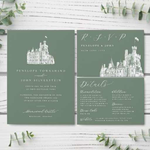Elegant Illustration Sage Green Castle Wedding Einladung