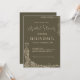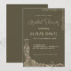 Eine elegante Brautduscheinlage mit einem schönen Dekor. Das Bild ist mit einem raffinierten olivfarbenen/braunen Hintergrund und cremefarbenen Dekoelementen gestaltet. In der verlassen unteren Ecke gibt es eine komplexe Abbildung eines Brautkleides mit verzierten wirbelnden Mustern und Blumendetails, die unten durch den Raum fließen. Die oberen und rechten Kanten haben eine zarte Reben- und Blattdekoration.