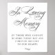 Dieses romantische und zeitlose "In Loving Memory: Von denen, die heute nicht hier sein können, aber in unserem Herzen immer präsent sind" Zeichen verleiht jedem klassischen Hochzeitsempfang, Dusche oder Party eine schlichte Eleganz. Die luxuriöse Schrift-Vorlage verfügt über eine skurrile und schöne moderne schwarze Kalligraphie Schrift auf weißem Hintergrund. Der hübsche Schriftart mit einer individuell anpassbaren Hintergrundfarbe macht es einfach, sich jedem Thema anzupassen. Für andere Farben oder passende Produkte, besuchen Sie bitte den JustFharryn Zazzle Store, oder kontaktieren Sie den Designer, c/o Fharryn@yahoo.com Alle Rechte vorbehalten. #zazzlemade