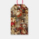 This Christmas gift tag has a vintage Victorian style, featuring an elegant collage of classic holiday elements. The design includes richly detailed illustrations of Santa Claus, angels, Victorian-era women, and festive decorations like poinsettias, pinecones, and ornaments. The color palette is dominated by deep reds, ivory, gold, and soft browns, creating a luxurious and nostalgic feel. Each element is framed in ornate, gilded borders with a touch of sparkle, enhancing the antique and opulent appearance. This wrapping paper evokes a warm, traditional Christmas charm perfect for a classic holiday setting.
