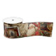 This Christmas ribbon has a vintage Victorian style, featuring an elegant collage of classic holiday elements. The design includes richly detailed illustrations of Santa Claus, angels, Victorian-era women, and festive decorations like poinsettias, pinecones, and ornaments. The color palette is dominated by deep reds, ivory, gold, and soft browns, creating a luxurious and nostalgic feel. Each element is framed in ornate, gilded borders with a touch of sparkle, enhancing the antique and opulent appearance. This ribbon evokes a warm, traditional Christmas charm perfect for a classic holiday setting.