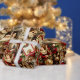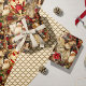 This Christmas wrapping paper pattern has a vintage Victorian style, featuring an elegant collage of classic holiday elements. The design includes richly detailed illustrations of Santa Claus, angels, Victorian-era women, and festive decorations like poinsettias, pinecones, and ornaments. The color palette is dominated by deep reds, ivory, gold, and soft browns, creating a luxurious and nostalgic feel. Each element is framed in ornate, gilded borders with a touch of sparkle, enhancing the antique and opulent appearance. This wrapping paper evokes a warm, traditional Christmas charm perfect for a classic holiday setting.