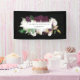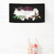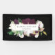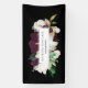 Eleganter, farbenfroher, moderner Bouquet aus Elfenbeinblumen, weiß und pflaumenviolett mit üppigem grünem Blattwerk, Banner.