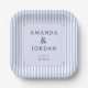 This elegant wedding plate features a clean, modern design with vertical blue stripes framing a soft lavender central panel. The layout is symmetrical and balanced, showcasing customizable text in a classic serif font that adds sophistication to the minimalist aesthetic. Perfect for formal occasions, this design conveys a mood of understated luxury and timeless beauty, making it an ideal choice for couples seeking a refined yet contemporary look for their special day.