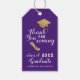 Erstellen Sie personalisierte lila, weiß und gold Klasse von 2025 Abschluss Geschenketiketten mit Danke für das kommende Sprichwort, und Graduiertenmütze und Diplomabbildungen. Das Template-Design macht es einfach, den Namen des Absolventen und ein Jahr einzutippen.