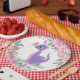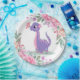 Ich hoffe, Sie werden diesen lila und rosa Dinosaurier mit einem rosa Schmetterling an der Nase und botanischen Blume genießen. Es stehen passende Produkte und Einladungen zur Verfügung.