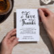 Express your heartfelt appreciation with this Elegant Love and Thanks Script Wedding Thank You Card. Designed in a timeless black and white palette, it features modern handwritten calligraphy and minimalist typography that beautifully complements any wedding theme. Perfect for newlyweds to thank guests for their love, presence, and thoughtful gifts. This customizable card adds a personal touch to your post-wedding gratitude, whether you choose to include a photo, message, or signature.