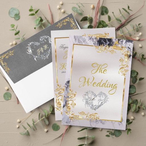 Elegant Marble, White, Gold Frame, Silver Heart Einladung